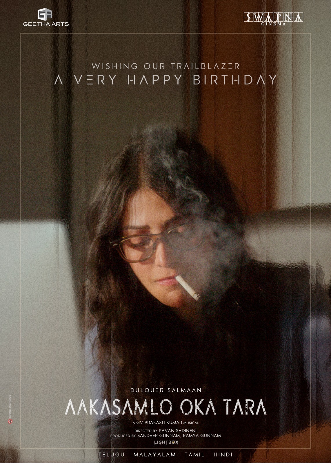 தொடர்ச்சியான பிளாக்பஸ்டர் வெற்றிகளாலும், பான்-இந்தியா அளவிலான புகழாலும் உச்சத்தில் இருக்கும் நட்சத்திர நடிகர் துல்கர் சல்மான், அடுத்ததாக “ஆகாசம்லோ ஒக தாரா” படத்தில் நடித்து வருகிறார் . புதுமையான கதை சொல்லல் மற்றும் தனித்துவமான காட்சி அமைப்புகளுடன், பல வெற்றிப்படங்களைத் தந்து, புகழ் பெற்ற பவன் சடினேனி ( Pavan Sadineni ) இப்படத்தை இயக்குகிறார் . புகழ்பெற்ற Geetha Arts மற்றும் Swapna Cinema வழங்கும் இந்த திரைப்படத்தை, சந்தீப் குன்னம் மற்றும் ரம்யா குன்னம் தயாரிக்கின்றனர். புதுமுக நடிகை சாத்விகா வீரவள்ளி துல்கர் சல்மானுக்கு ஜோடியாக நடித்துள்ளார். இதற்கு முன்பு வெளியான புரமோக்கள், ரசிகர்களின் மத்தியில் பெரும் வரவேற்பைப் பெற்றதுடன், இப்படத்தின் மீது பெரும் எதிர்பார்ப்பை ஏற்படுத்தியுள்ளது.இதற்கிடையில், படக்குழு ரசிகர்களுக்கு ஒரு இனிய ஆச்சரியத்தை வழங்கியுள்ளது. சமீப காலமாக தேர்ந்தெடுத்த படைப்புகளில் மட்டுமே நடிக்கும் நடிகை ஸ்ருதி ஹாசன், ஒரு முக்கியமான கதாபாத்திரத்தில் இந்தப் படத்தில் இணைந்துள்ளார். அவரது பிறந்தநாளை முன்னிட்டு, அவரின் ஃபர்ஸ்ட் லுக் போஸ்டரை படக்குழு வெளியிட்டுள்ளது. போஸ்டரில் கண்ணாடியுடன், கீழ்நோக்கி பதிந்த தீவிரமான பார்வையுடன், இயல்பான தோற்றத்தில் இருக்கிறார் —அது அவரின் கதாபாத்திரத்தின் தீவிரத்தைக் காட்டுகிறது. அவரது உதட்டில் இருக்கும் சிகரெட்டும், மேலெழும் புகையும், அந்த கதாபாத்திரத்தில் உள்ள உணர்ச்சி ஆழத்தையும் சொல்லப்படாத கதைகளையும் சுட்டிக்காட்டுகிறது.